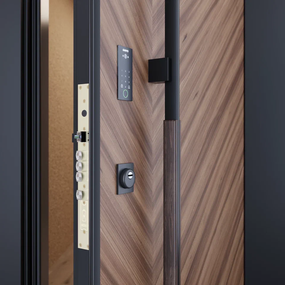 * **MODERN SMART CH — флагман коллекции:** Воплощение самых смелых инженерных и дизайнерских решений. Именно эта модель, представленная на выставке MOSBUILD 2025, была отмечена посетителями как лучший дизайн. Здесь сочетаются: интеллектуальные замки с Face ID, многофакторная биометрия, ручка-скоба из нержавеющей стали с покрытием нитрид титана «золото» и накладками из натурального дуба. Абсолютная вершина стиля и технологий.