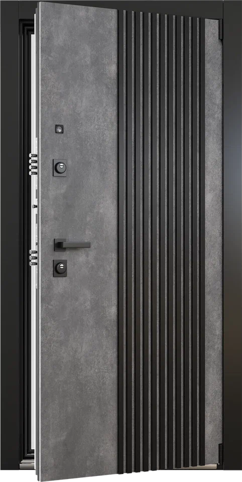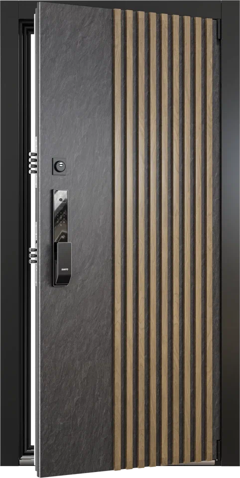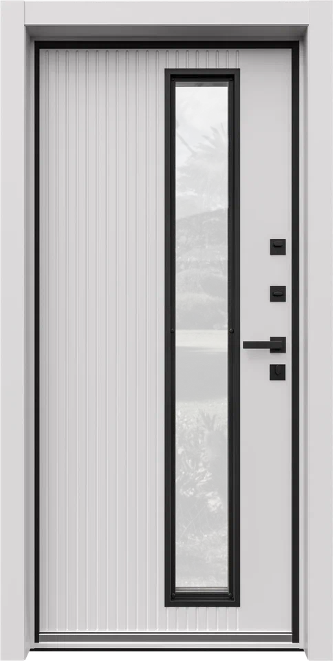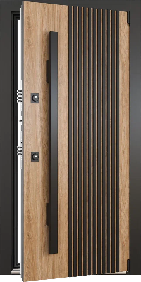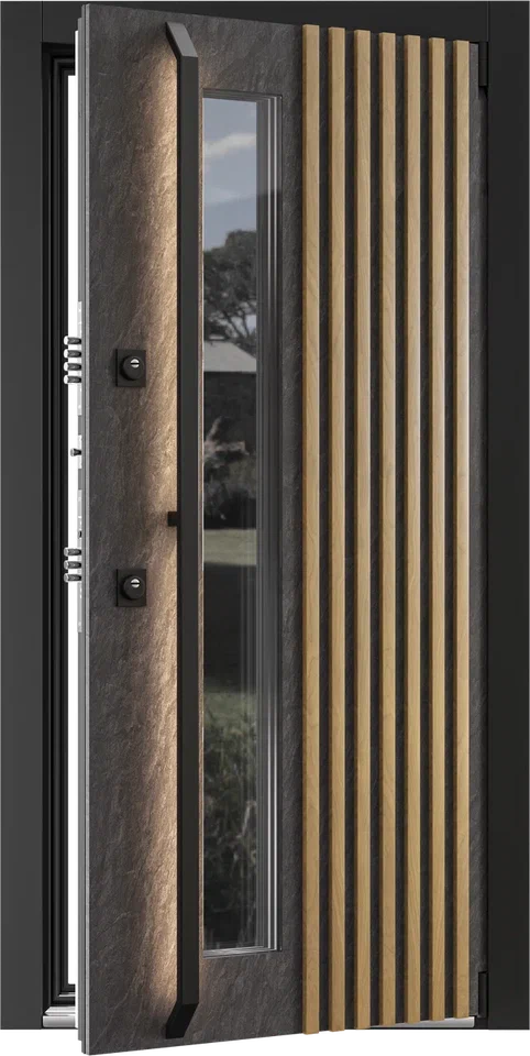 Коллекционная дверь с узким панорамным окном, откры - вающим вид в мир. Наружная отделка деревянными рейка - ми придает модели респектабельный внешний вид. Ин - новационная ручка-скоба с LED-подсветкой на всю высоту создает выразительную архитектурную графику в темное время суток. Прочная отделка HPL-материалом гарантирует долговечность. Технология терморазрыва обеспечивает максимальную энергоэффективность вашего пространства. Встречайте дверь, в которой гармонично сочетаются дерзкий дизайн и интеллектуальная инженерия.