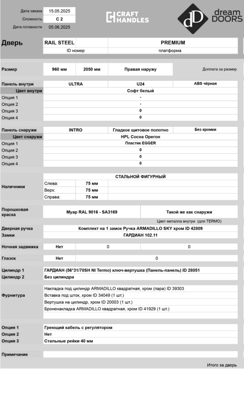 • Надежность и долговечность: Прочная конструкция и качественные материалы гарантируют долгий срок службы двери. Мы уверены в нашей продукции!