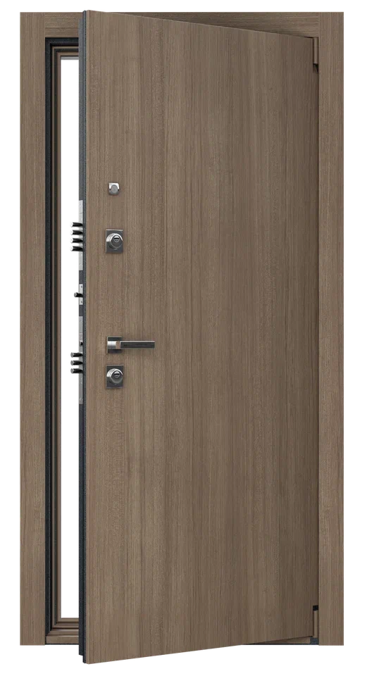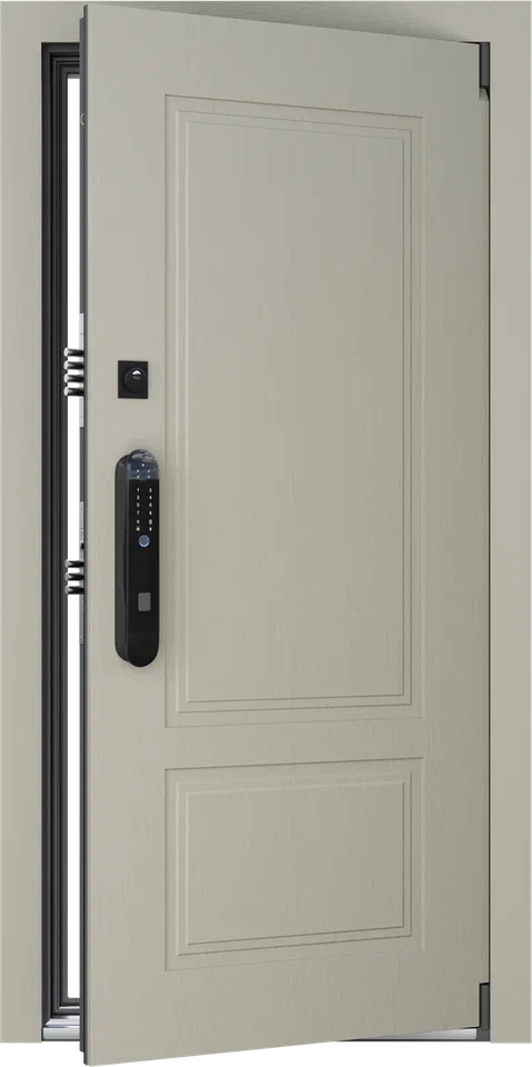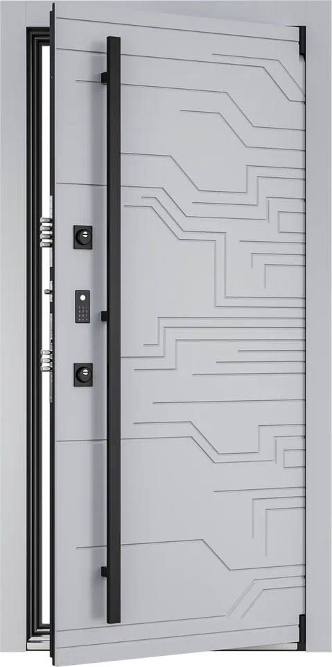 BRAVO — Базовая дверь премиум-класса с улучшеyной звукоизоляцией. Индивидуальность снаружи, практичность внутри. Индивидуальный фрезерованный рисунок на наружной МДФ-панели и практичное панорамное зеркало внутри. Комплектации: от классической фурнитуры до биометрии и умного дома. Идеальный старт с широкими возможностями апгрейда для проектов любого масштаба от жилых комплексов до коммерческих объектов. Ваша дверь, ваш выбор.