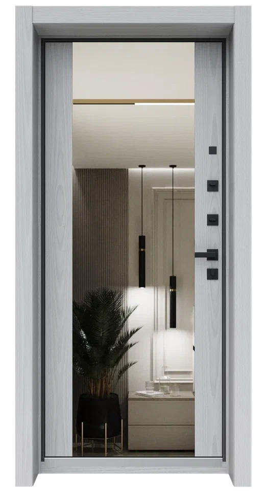 Базовая дверь премиум-класса с улучшен - ной звукоизоляцией. Индивидуальность снаружи, практичность внутри. Индивидуальный фрезеро - ванный рисунок на наружной МДФ-панели и прак - тичное панорамное зеркало внутри. Комплектации: от классической фурнитуры до биометрии и умного дома. Идеальный старт с широкими возможностями апгрейда для проектов любого масштаба — от жилых комплексов до коммерческих объектов. Ваша дверь, ваш выбор.