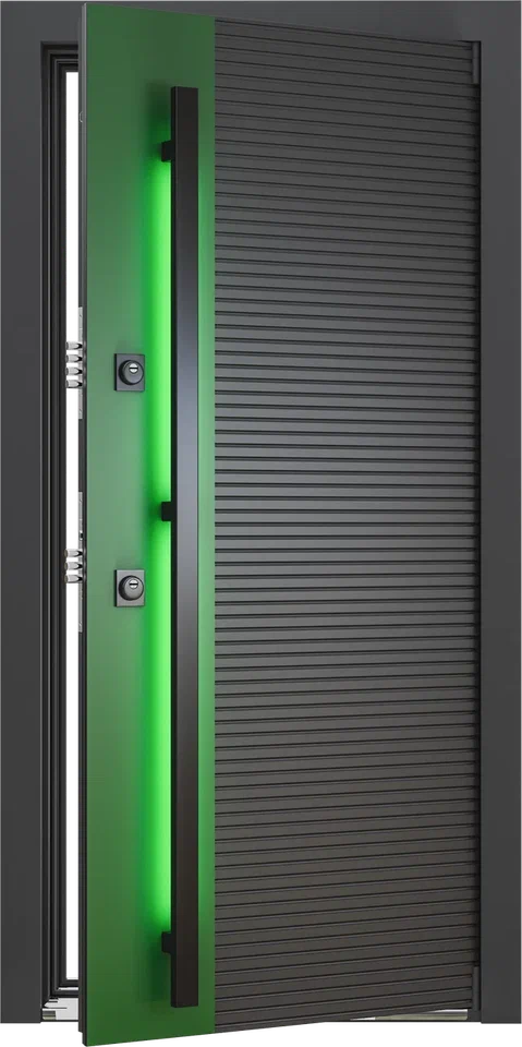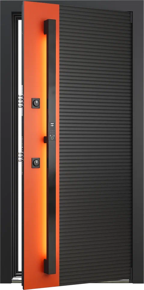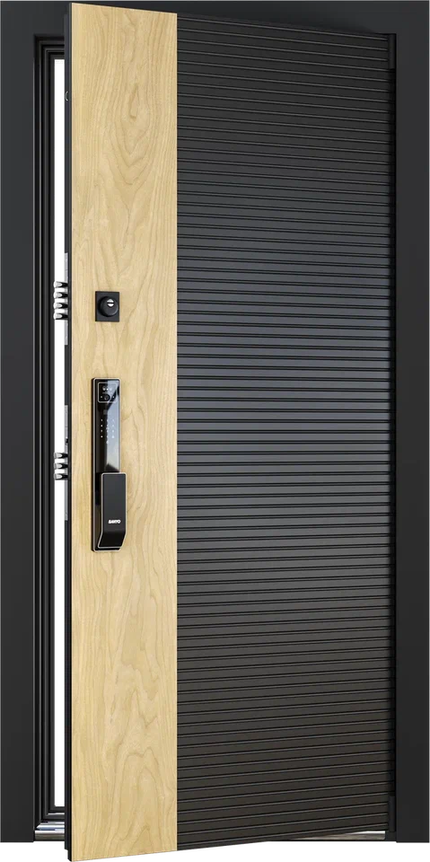 MEGAPOLIS — инновационная входная дверь с трендовым дизайном: чёрный фрезерованный MDF/PVC и контрастная древесная вставка. Отличная шумоизоляция. База для 4-х комплектаций: от классики до умной двери с биометрией, подсветкой и ручками CRAFT HANDLES. Подходит для квартир и коммерции. Дизайн и функционал — на ваш выбор.